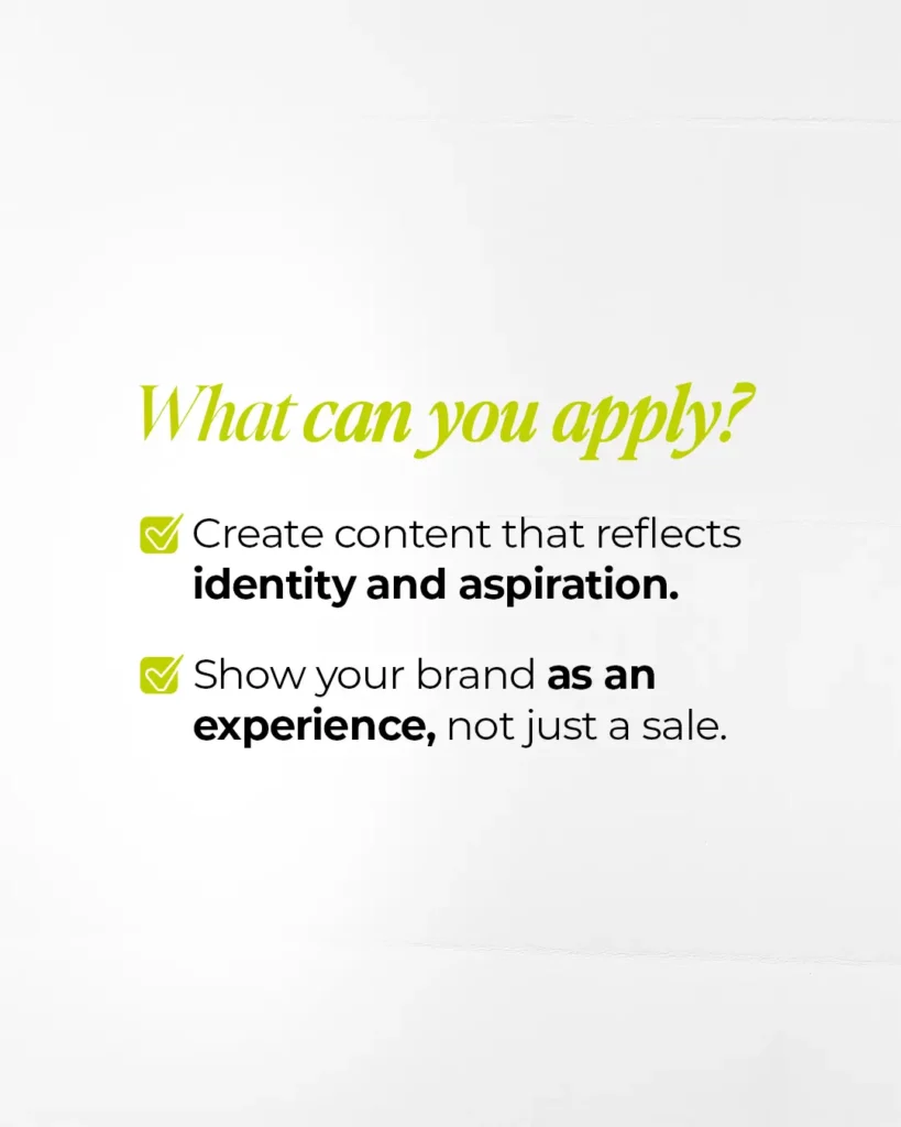 Shift your focus from features to feelings. Create content that reflects your audience’s aspirations and positions your brand as a key part of their desired identity and experience.